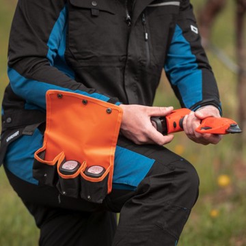 Il fodero in nylon, con rivestimento interno in pvc che mantiene salde le batterie, è dotato di tre pratiche tasche con dimensioni 7 x 5 x h 8 cm, adatte per tutte le batterie con sistema click-in per forbici elettriche.