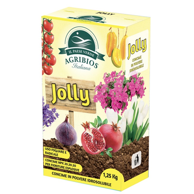 DESCRIZIONE JOLLY è un concime con un apporto equilibrato di azoto, fosforo e potassio e un pool di microelementi chelati che lo rende indicato per tutte le colture in qualsiasi fase fenologica della pianta prevenendo fisiopatie o carenze nutrizionali. JOLLY favorisce un maggiore vigore vegetativo, migliora l’allegagione e la fioritura, aumenta il grado zuccherino e la qualità dei frutti e sostiene la pianta nelle fasi critiche, come il trapianto, e nelle condizioni ambientali sfavorevoli. Distribuito sulle piante fiorite JOLLY assicura fioriture abbondanti e colorazione intensa.