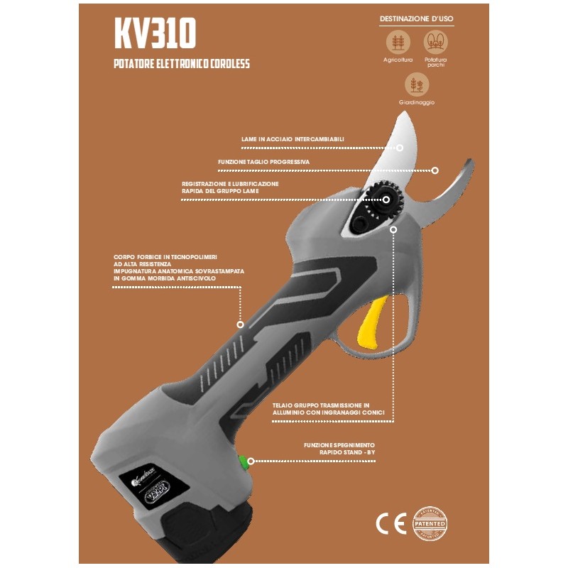 KV310 rappresenta la scelta ideale per lavori di potatura in agricoltura e giardinaggio. Grazie alla durata di funzionamento di 3 ore e mezza, fornite dalla batteria al litio ricaricabile incorporata con caricatore a 3 vie, e al motore brushless da 150W permette un lavoro rapido e continuativo. È dotata di lame in acciaio intercambiabili con capacità di taglio massima del diametro di 28-30mm, impugnatura ergonomica in tecnopolimero ad alta resistenza e funzione di spegnimento rapido stand-by. Con opzione di taglio progressivo.