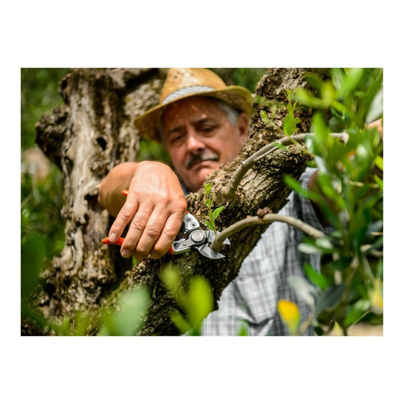 Forbice a doppio taglio, perfetta per la potatura delle piante da frutto e degli olivi. Il peso estremamente leggero di soli 240 g e la forma ergonomica del manico diminuiscono l'affaticamento della mano dell'operatore.