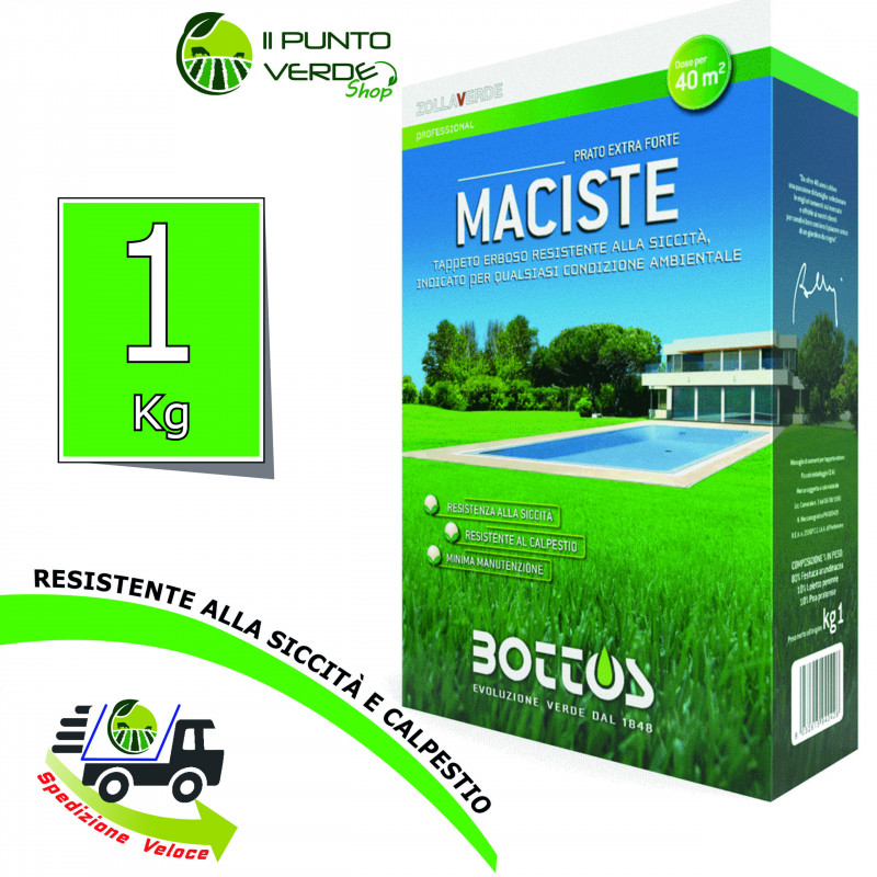 DESCRIZIONE Miscuglio ideale a tessitura medio–grossa per aree mediterraneocontinentali, calde, esposte a sud e con evidenti problemi di temperature estive e di rischio di siccità. Maciste è anche la risposta giusta per qualsiasi tipo di terreno, adatto anche all’ombra fino al 50% in meno di luce diretta e perciò indicato perfino all’ombra di conifere. Velocissimo nella fase d’impianto iniziale, colonizza immediatamente gli spazi, non lasciando sfogo alle potenziali essenze infestanti. Tappeto erboso costituito da cultivar di origine americana con colorazione verde brillante anche nella stagione fredda. Tappeto che a piena maturità, si presenta con elevata densità e uniformità. Tollerante alla Macchia bruna estiva. Ideale per la costruzione di tappeti erbosi ricreazionali, ornamentali, ma anche per aree più marginali.