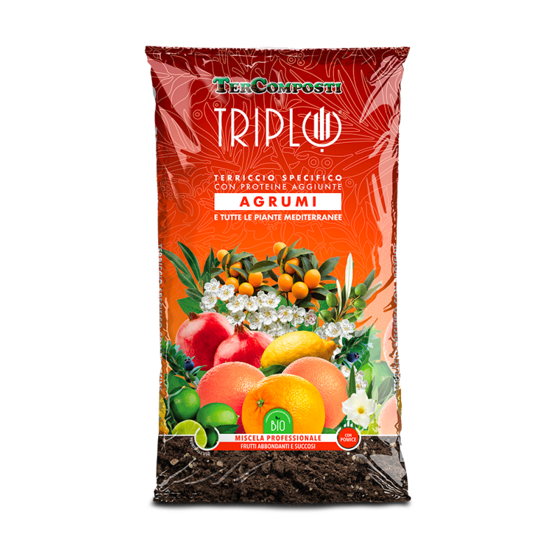 Queste tipologie di piante richiedono elevata disponibilità di acqua e di elementi nutritivi durante la vegetazione, mentre esigono rapidità di drenaggio e forte aerazione delle radici durante la stagione di stasi vegetativa, TRIPLO AGRUMI è una miscela professionale che risponde a queste esigenze in quanto è composta da torbe strutturate, pomice e un nutriente organico a lento rilascio, da utilizzare sia per la coltivazione in vaso sia per il riempimento delle buche di impianto in piena terra. La presenza di pomice garantisce un corretto equilibrio tra aerazione e ritenzione idrica per prevenire il ristagno delle radici e la sua concimazione equilibrata e duratura senza eccessi salini a cui queste piante sono sensibili, favorisce la produzione di frutti abbondanti e succosi.